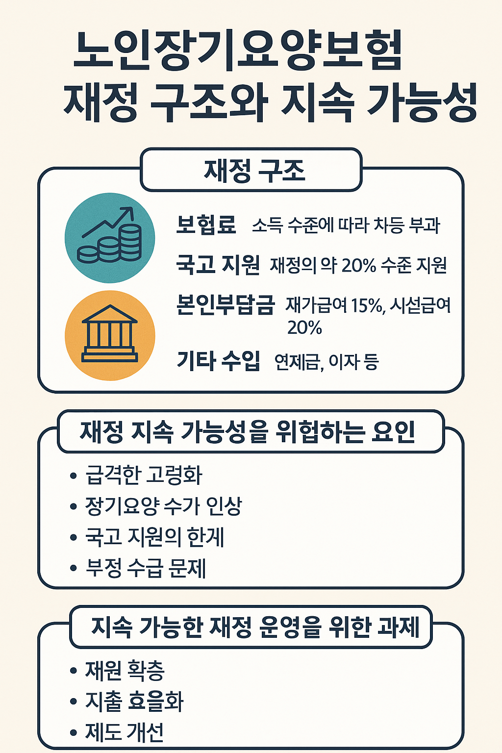 첫째, 재원 확충이다. 보험료율의 점진적 인상, 국고 지원 확대, 민간 재원과의 연계 등 다양한 재원 확보 방안을 모색해야 한다.