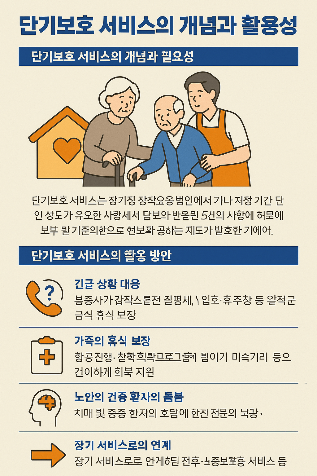 - 치매 환자나 중증 질환을 가진 어르신에게는 단기보호 서비스를 통해 전문적인 간호와 돌봄을 제공할 수 있다.