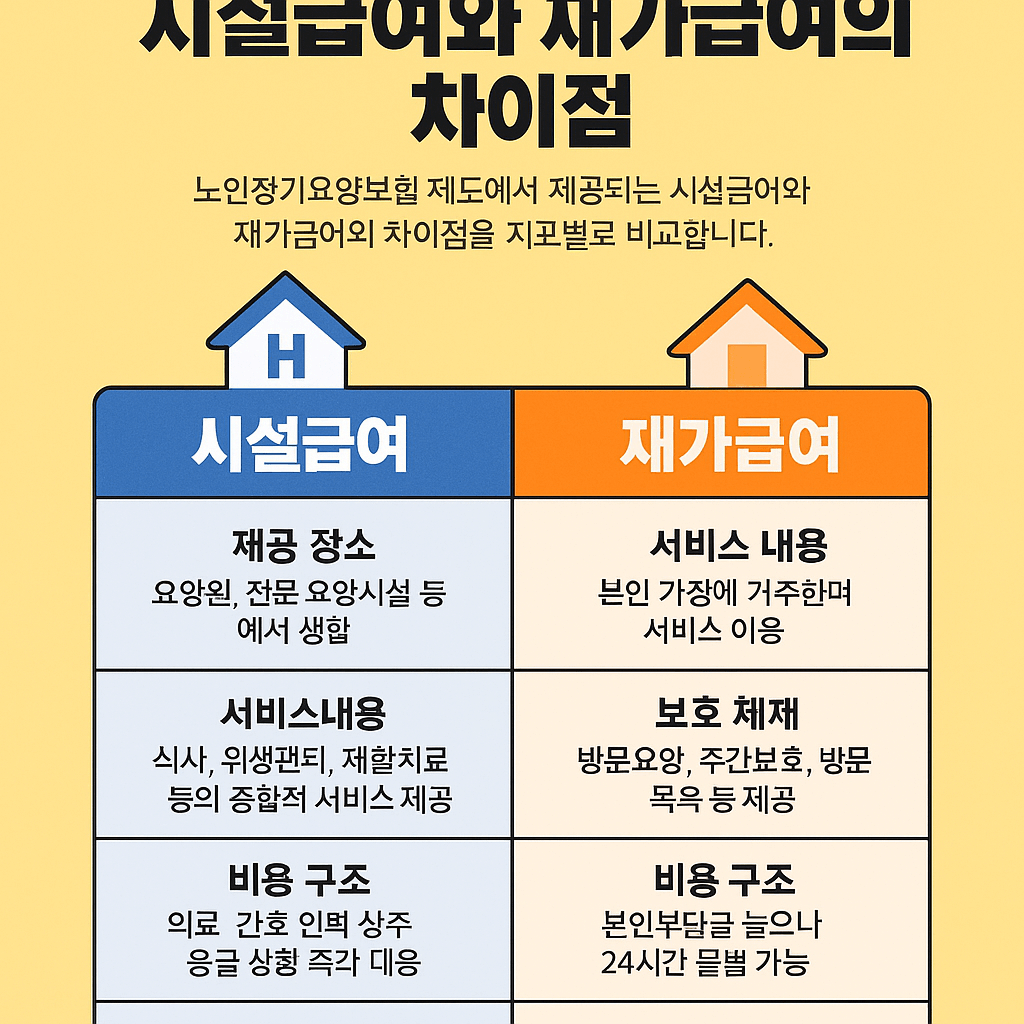 - 시설급여: 의료·간호 인력 상주, 응급상황 즉각 대응 가능.
