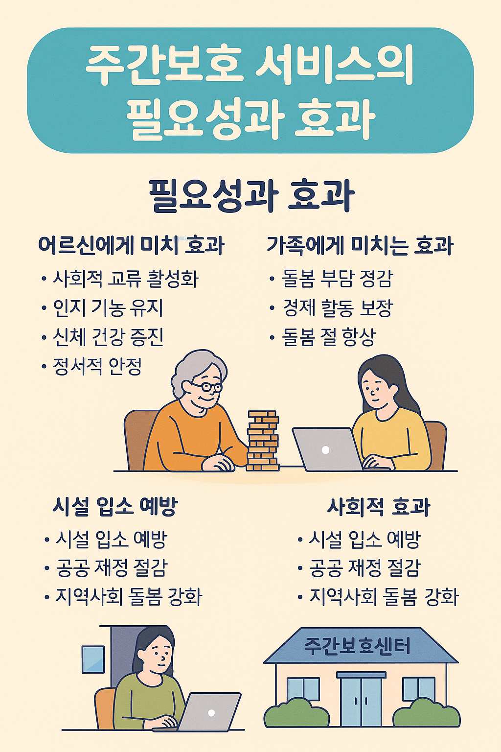 - 지역사회 돌봄 강화 : 주간보호센터가 지역 커뮤니티 허브 역할을 하여 복지 네트워크가 강화된다.