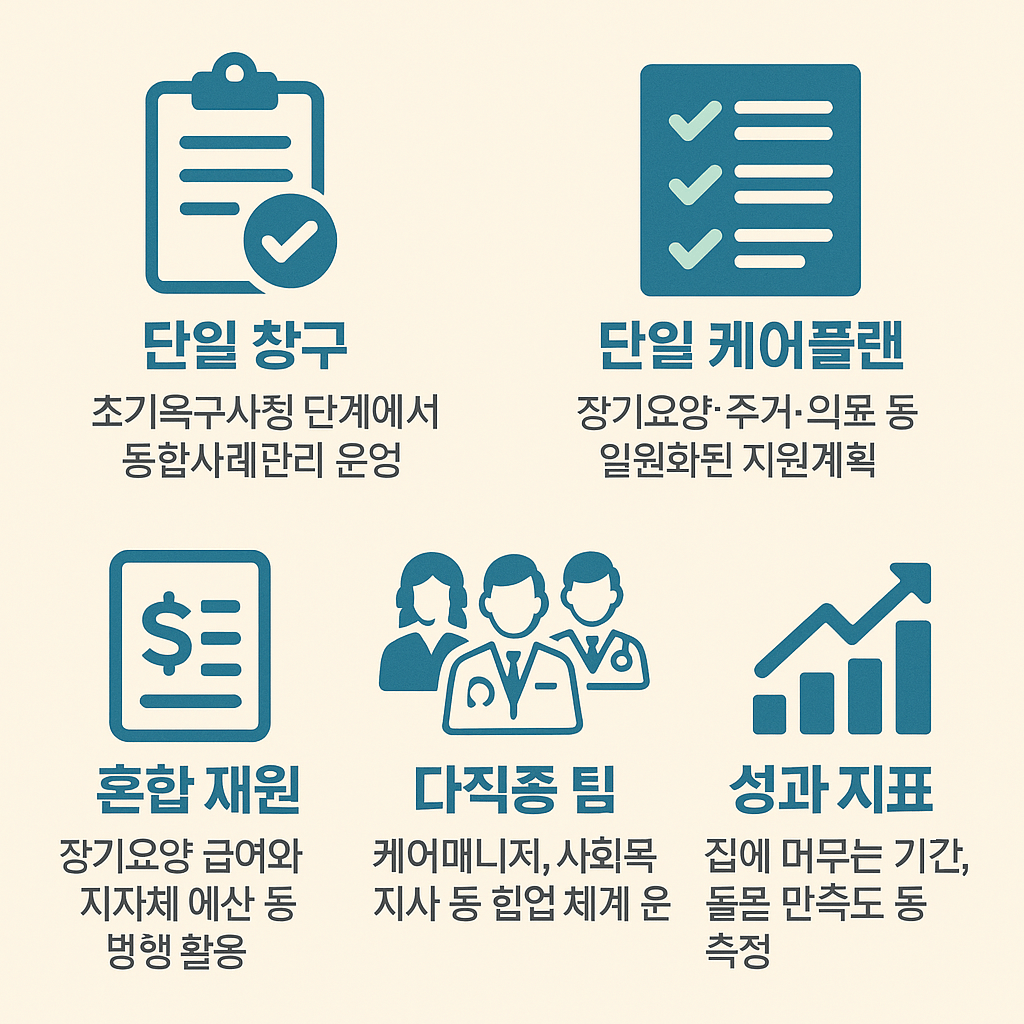 첫째, 데이터 연계와 성과관리다. 장기요양 급여정보, 보건소의 건강지표, 지자체 통합사례관리 기록, 응급이용 이력, 낙상·영양·우울 위험도 같은 생활지표를 표준화된 최소 공통데이터셋으로 묶어, 당사자 동의하에 안전하게 공유한다. 성과지표는 투입·산출 중심이 아닌 삶의 질과 ‘집에 머무는 기간(days at home)’, 불필요한 입원·응급 이용 감소, 낙상·욕창·영양상태 개선, 돌봄만족도, 가족 소진지수 등 결과지표로 설계한다. 둘째, 케어매니지먼트 역량이다. 전담 케어매니저가 초기 통합사정→목표설정→플랜수립→자원조정→성과평가의 사이클을 주도하되, 요양보호사·간호사·사회복지사·작업치료사·영양사·주거코디네이터가 정기 사례회의에 참여해 역할을 분담한다. 셋째, 혼합재원과 결제 흐름이다. 장기요양 급여는 핵심 돌봄에, 지자체 예산은 주거개선·이동지원·식사지원 같은 비급여 영역에, 민간후원은 사회참여 프로그램에 배분하는 식으로 결합하며, 단일 청구서 형태로 묶어 이용자 체감 복잡도를 낮춘다. 넷째, 생활공간 중심 서비스 디자인이다. ‘집-동네거점-의료’의 동선에 맞춰 방문요양과 방문간호, 주간보호를 끼워 넣고, 커뮤니티 케어하우스 내에 주간보호실·낮병동·공유주방·운동실을 결합해 이동부담을 줄인다. 다섯째, 디지털·모빌리티 연계다. 응급버튼·낙상센서·복약알림·원격 모니터링, 교통약자 이동수단 예약 앱을 케어플랜에 기본 포함해 미사용 장벽을 낮춘다. 여섯째, 개인정보 보호와 동의다. 목적 제한, 최소수집, 보유기간 설정, 가명처리, 접근권한 로그감사를 표준으로 삼고, 이해하기 쉬운 동의서와 동의철회 절차를 제공한다. 일곱째, 형평성과 접근성이다. 농산어촌·저소득·독거·다문화 어르신에게 이동클리닉·순회사례회의·원격상담을 우선 배치해 ‘필요가 큰 곳에 자원을 먼저’ 투입한다. 여덟째, 가족지원과 휴식이다. 단기보호·가족상담·치료적 교육을 플랜에 의무 편성하고, 가족 소진지수에 따라 주간보호·야간돌봄 바우처를 탄력 배정한다. 아홉째, 현장 인력의 지속가능성이다. 요양보호사 교육에 통합사정·디지털기기 활용·의사소통·감정노동 관리 모듈을 포함하고, 순회형 슈퍼비전과 심리 지원을 상시화한다. 마지막으로, 평가와 확산이다. 파일럿→확대 적용의 단계에서 사전-사후 비교와 대조군 분석으로 성과를 검증하고, 성공모형의 표준 운영지침과 교육패키지를 만들어 타 지자체로 이전한다. 이 모든 단계는 ‘당사자의 목표’—넘어지지 않고 집에서 지내기, 시장에 다시 가보기, 손주와 영상통화하기 같은 일상의 목표—를 최상위 지표로 삼을 때 비로소 살아 움직인다.