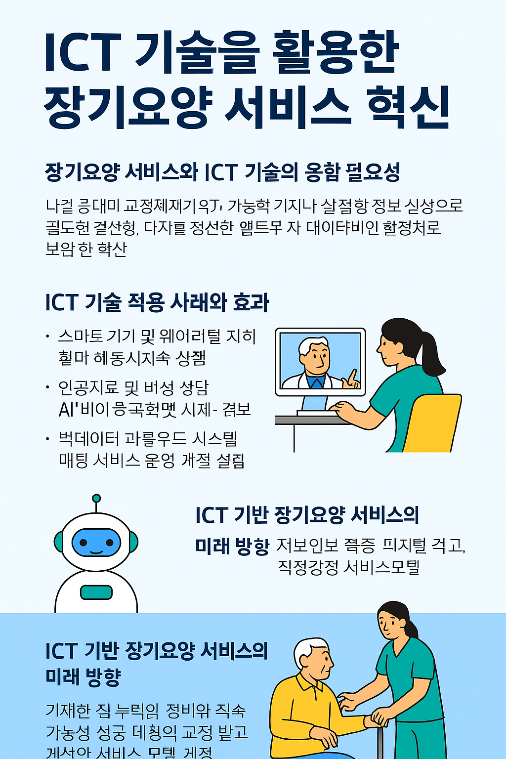 첫째, 스마트 기기와 웨어러블 기술은 어르신의 건강을 실시간으로 모니터링하여 낙상, 심장 이상, 치매 증상 등 돌발 상황을 조기에 발견할 수 있도록 돕습니다. 둘째, 원격의료와 화상 상담 서비스는 이동이 불편한 어르신에게 의료 접근성을 확대하며, 의료진과 요양보호사가 협력할 수 있는 기반을 제공합니다. 셋째, 인공지능(AI) 기반 돌봄 로봇과 음성비서는 정서적 교감을 돕고, 생활 습관 관리나 약 복용 알림 등 실질적 지원을 제공합니다. 넷째, 빅데이터와 클라우드 시스템은 장기요양기관의 서비스 운영을 체계적으로 관리하고, 개인별 맞춤형 케어플랜 수립을 가능하게 합니다. 이러한 ICT 도입은 장기요양 서비스의 효율성과 품질을 동시에 향상시키며, 궁극적으로 돌봄의 사각지대를 줄이는 효과를 가져옵니다.
